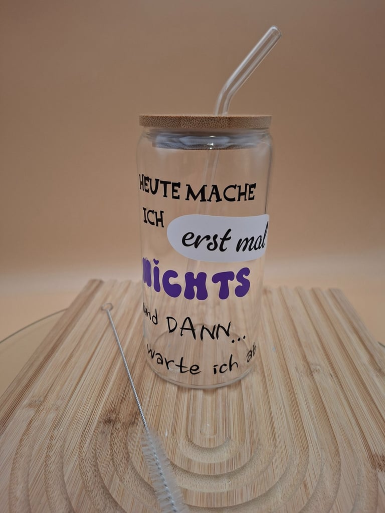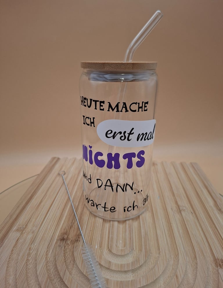 Trinkgläser mit Spruch, Bambusdeckel und Glasstrohhalm